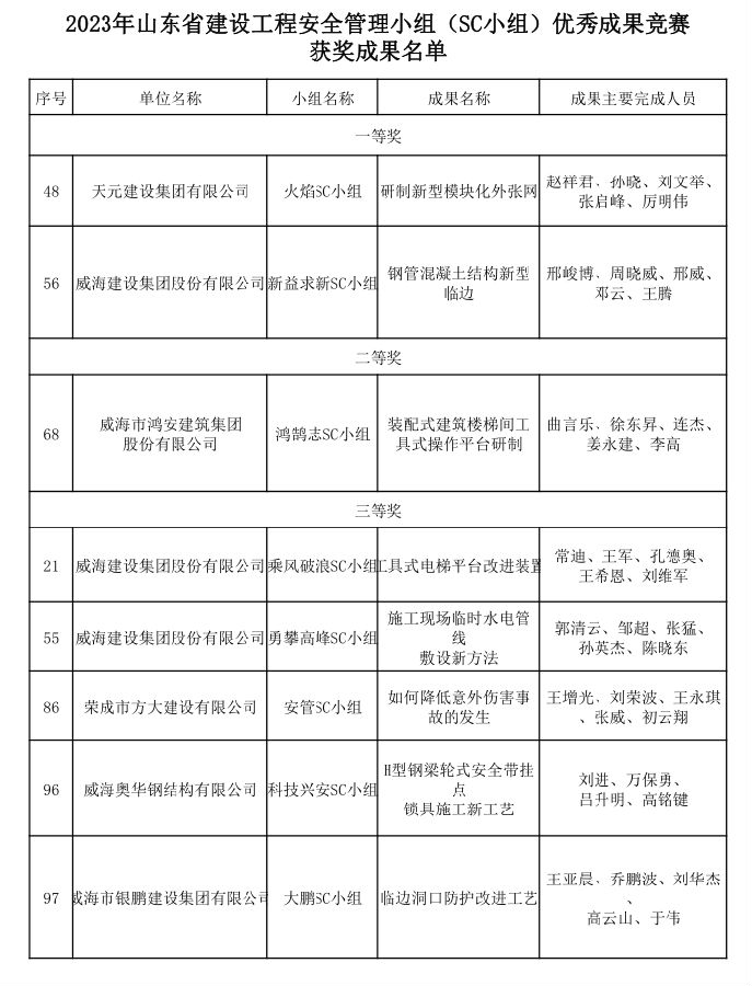 近日,山東省建筑安全與設(shè)備管理協(xié)會下發(fā)《關(guān)于公布2023年山東省建設(shè)工程安全管理小組(SC小組)優(yōu)秀創(chuàng)新成果競賽獲獎成果名單的通知》,我市共8項(xiàng)成果獲得2023年山東省建設(shè)工程安全管理小組(SC小組)優(yōu)秀創(chuàng)新成果,其中,一等獎2項(xiàng),二等獎1項(xiàng),三等獎5項(xiàng)。