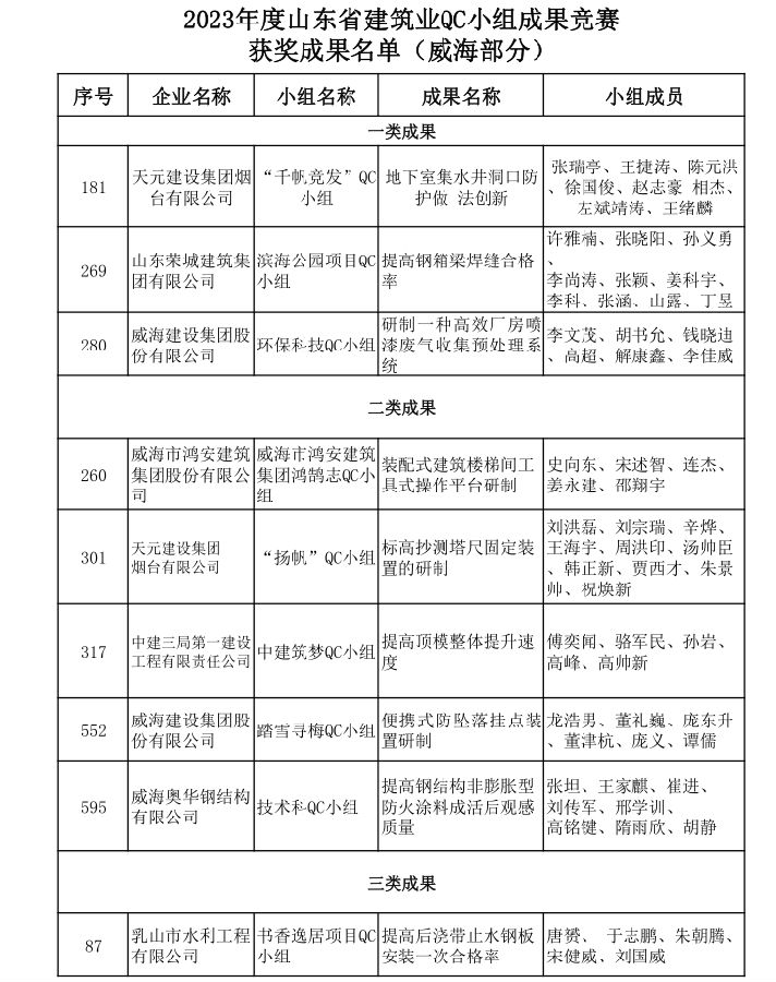 近日,山東省建筑業(yè)協(xié)會下發(fā)《關于公布2023年度山東省建筑業(yè)QC小組成果競賽獲獎成果的通知》,我市22項成果榮獲2023年度山東省建筑業(yè)QC小組競賽獲獎成果,其中,一等獎3項,二等獎5項,三等獎20項。