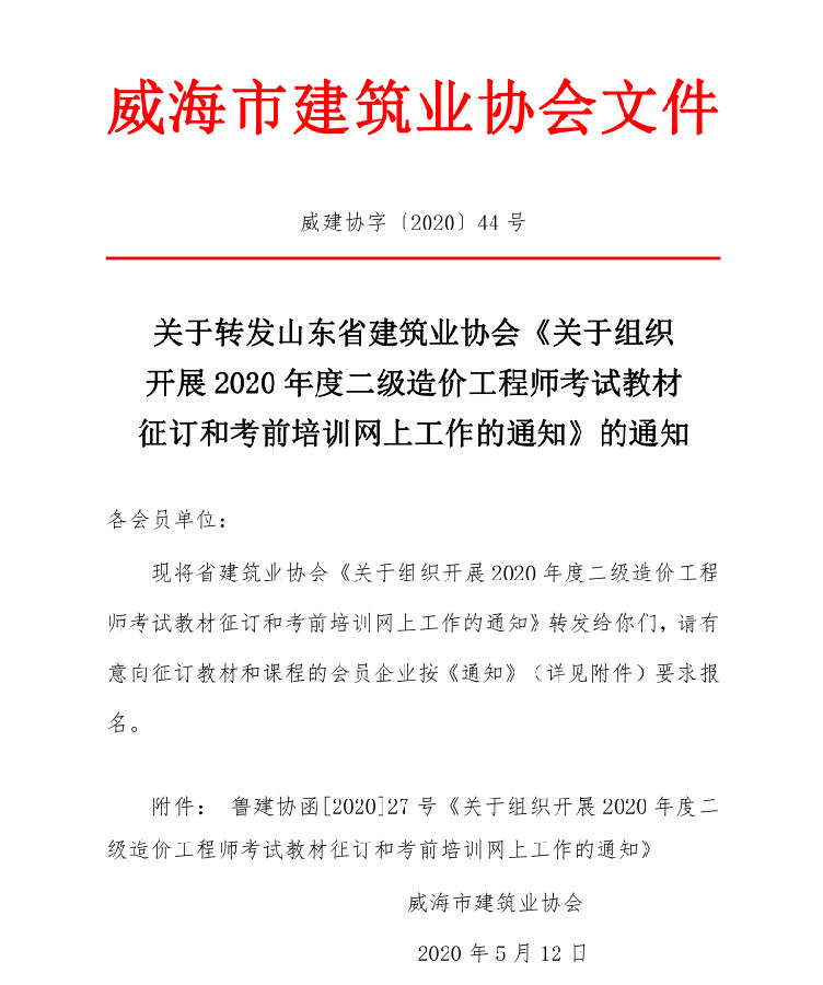 - 當(dāng)前位置:首頁(yè) >文件公告>關(guān)于轉(zhuǎn)發(fā)山東省建筑業(yè)協(xié)會(huì)《關(guān)于組織 開展2020年度二級(jí)造價(jià)工程師考試教材 征訂和考前培訓(xùn)網(wǎng)上工作的通知》的通知