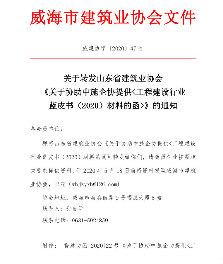 關(guān)于轉(zhuǎn)發(fā)山東省建筑業(yè)協(xié)會 《關(guān)于協(xié)助中施企協(xié)提供<工程建設(shè)行業(yè) 藍皮書(2020)材料的函>》的通知