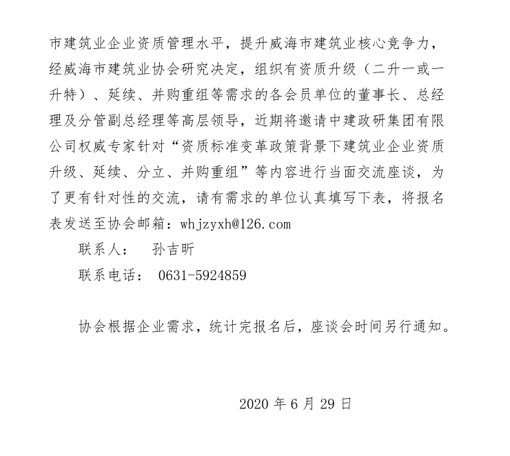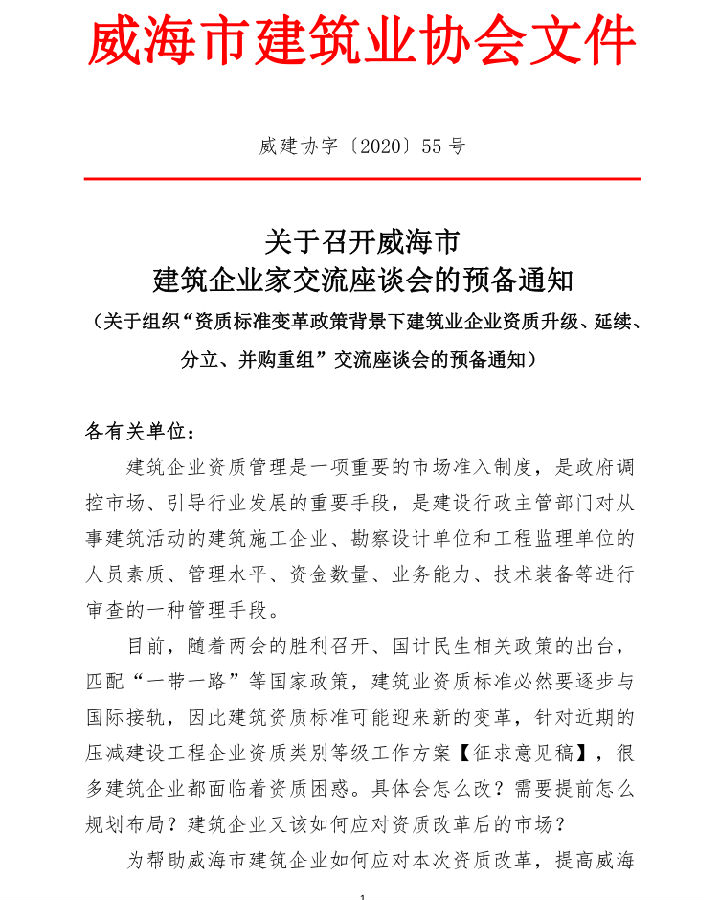 >關于召開威海市建筑企業(yè)家交流座談會的預備通知