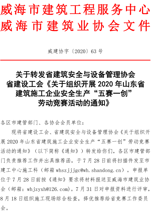 關(guān)于轉(zhuǎn)發(fā)省建筑安全與設(shè)備管理協(xié)會 省建設(shè)工會《關(guān)于組織開展2020年山東省 建筑施工企業(yè)安全生產(chǎn)“五賽一創(chuàng)” 勞動競賽活動的通知》
