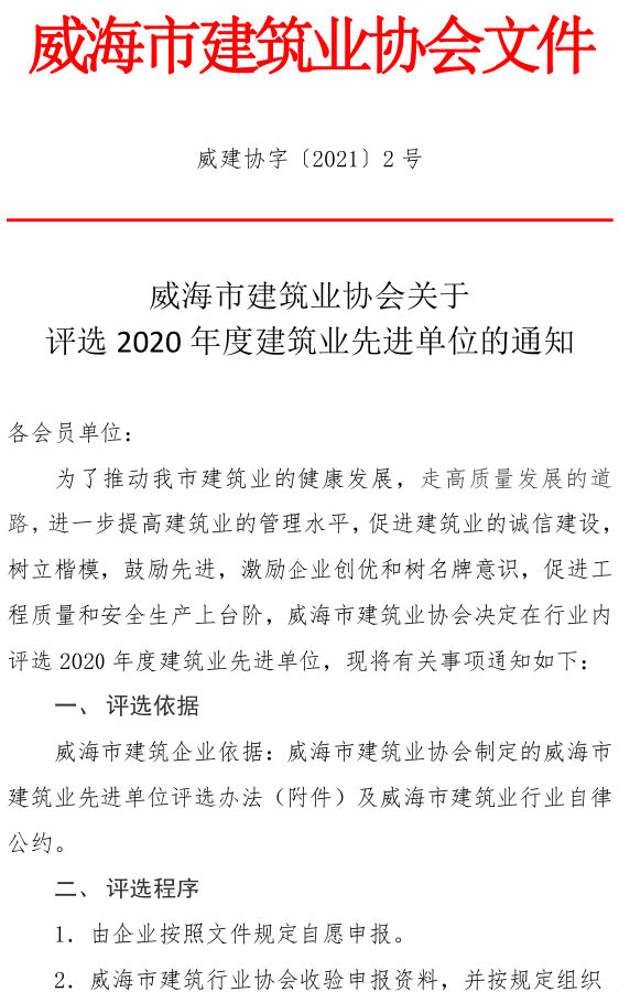 威海市建筑業(yè)協(xié)會關(guān)于 評選2020年度建筑業(yè)先進(jìn)單位的通知