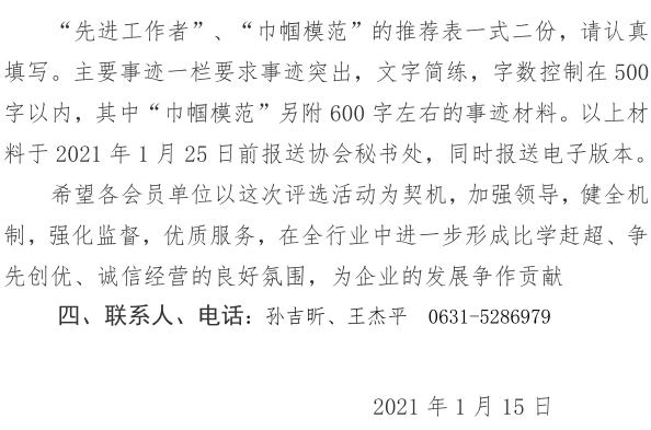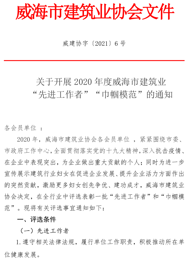 >關(guān)于開展2020年度威海市建筑業(yè) “先進(jìn)工作者”“巾幗模范”的通知