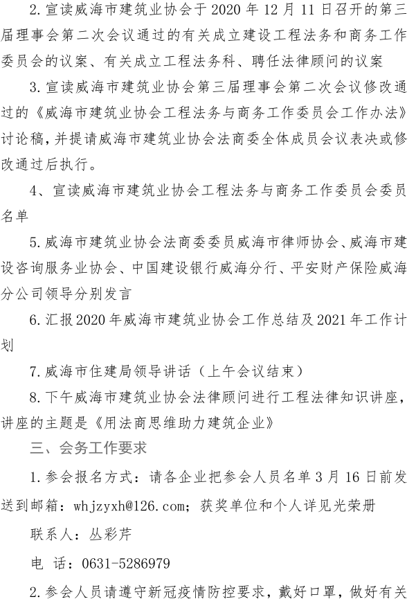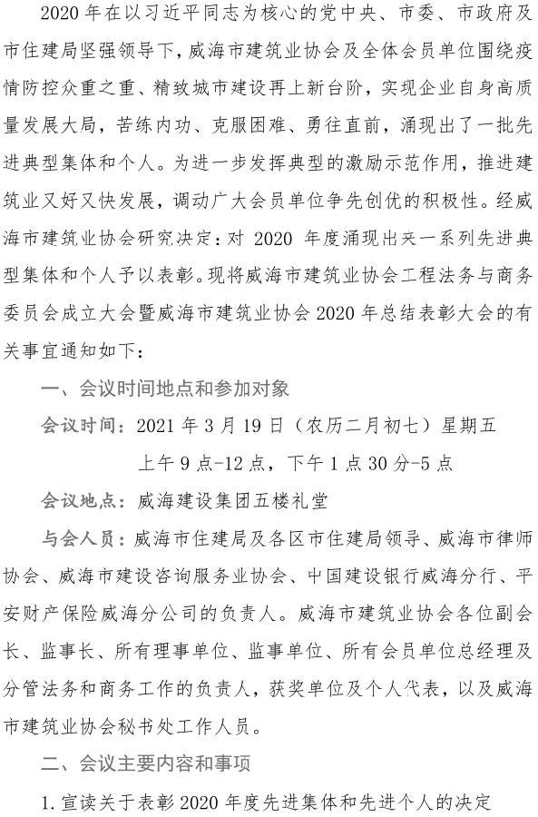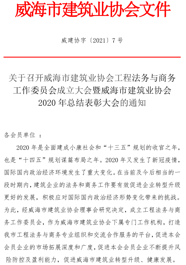 關(guān)于召開威海市建筑業(yè)協(xié)會工程法務(wù)與商務(wù) 工作委員會成立大會暨威海市建筑業(yè)協(xié)會 2020年總結(jié)表彰大會的通知