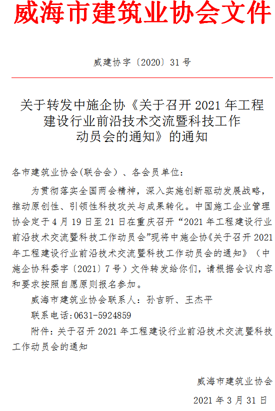 >關(guān)于轉(zhuǎn)發(fā)中施企協(xié)《關(guān)于召開2021年工程 建設(shè)行業(yè)前沿技術(shù)交流暨科技工作 動員會的通知》的通知