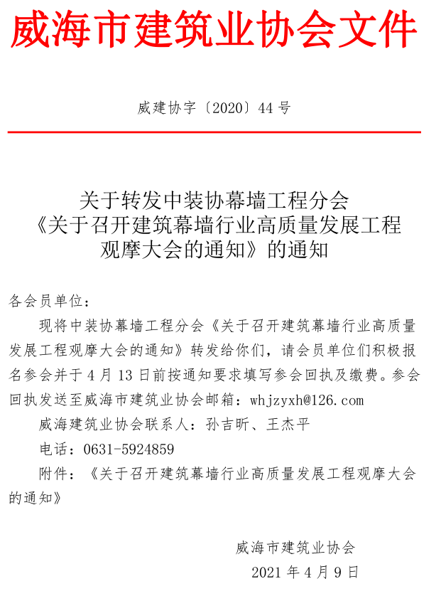 關(guān)于轉(zhuǎn)發(fā)中裝協(xié)幕墻工程分會 《關(guān)于召開建筑幕墻行業(yè)高質(zhì)量發(fā)展工程 觀摩大會的通知》的通知