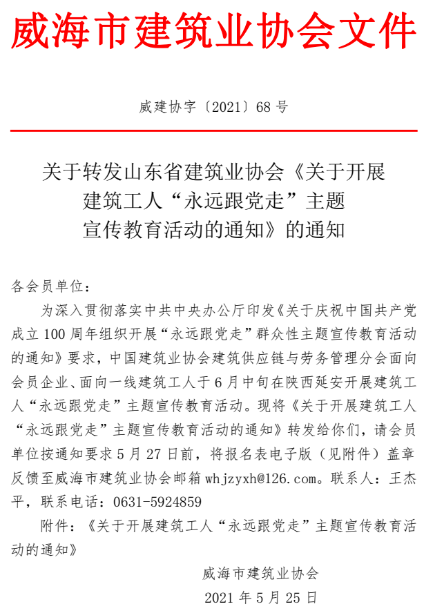 關(guān)于轉(zhuǎn)發(fā)山東省建筑業(yè)協(xié)會《關(guān)于開展 建筑工人“永遠(yuǎn)跟黨走”主題 宣傳教育活動的通知》的通知