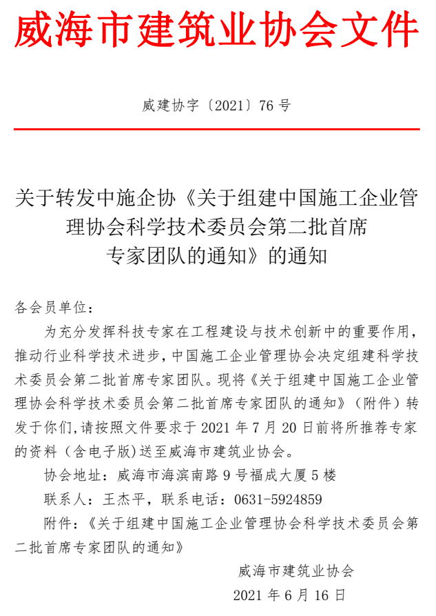 關(guān)于轉(zhuǎn)發(fā)中施企協(xié)《關(guān)于組建中國(guó)施工企業(yè)管理協(xié)會(huì)科學(xué)技術(shù)委員會(huì)第二批首席 專家團(tuán)隊(duì)的通知》的通知
