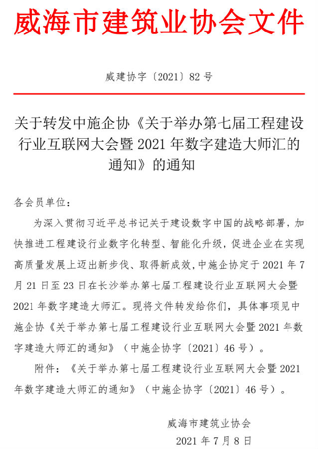 關(guān)于轉(zhuǎn)發(fā)中施企協(xié)《關(guān)于舉辦第七屆工程建設(shè)行業(yè)互聯(lián)網(wǎng)大會(huì)暨2021年數(shù)字建造大師匯的通知》的通知?