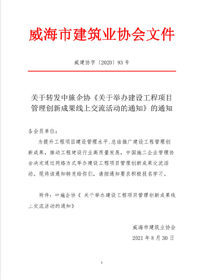 關于轉(zhuǎn)發(fā)中施企協(xié)《關于舉辦建設工程項目管理創(chuàng)新成果線上交流活動的通知》的通知