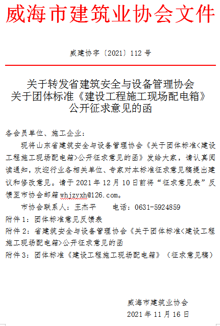 關(guān)于轉(zhuǎn)發(fā)省建筑安全與設(shè)備管理協(xié)會(huì)關(guān)于團(tuán)體標(biāo)準(zhǔn)《建設(shè)工程施工現(xiàn)場(chǎng)配電箱》公開(kāi)征求意見(jiàn)的函的通知