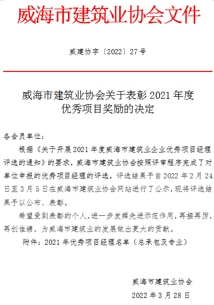 >威海市建筑業(yè)協(xié)會關(guān)于表彰2021年度優(yōu)秀項目經(jīng)理的決定