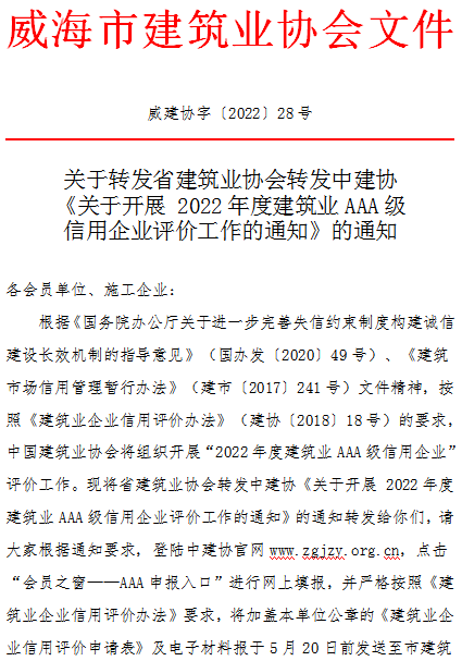 關(guān)于轉(zhuǎn)發(fā)省建筑業(yè)協(xié)會(huì)轉(zhuǎn)發(fā)中建協(xié)《關(guān)于開(kāi)展 2022年度建筑業(yè)AAA級(jí)信用企業(yè)評(píng)價(jià)工作的通知》的通知