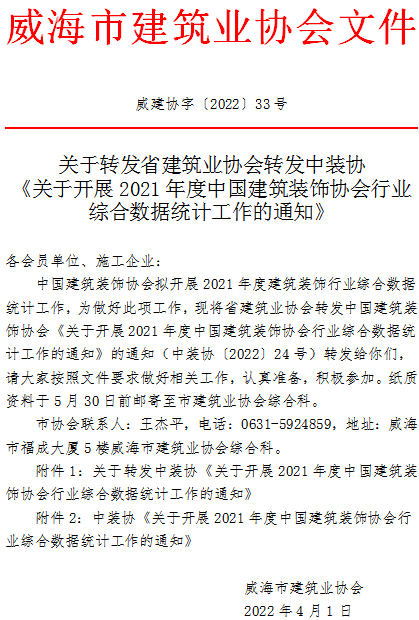 關(guān)于轉(zhuǎn)發(fā)省建筑業(yè)協(xié)會轉(zhuǎn)發(fā)中裝協(xié)《關(guān)于開展2021年度中國建筑裝飾協(xié)會行業(yè)綜合數(shù)據(jù)統(tǒng)計(jì)工作的通知》