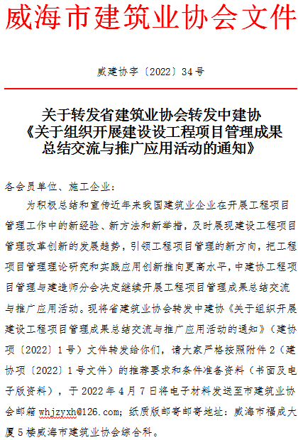 關(guān)于轉(zhuǎn)發(fā)省建筑業(yè)協(xié)會轉(zhuǎn)發(fā)中建協(xié)《關(guān)于組織開展建設(shè)設(shè)工程項目管理成果總結(jié)交流與推廣應(yīng)用活動的通知》