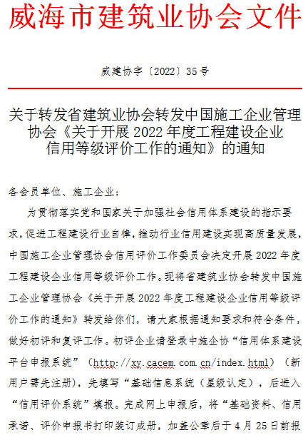 關(guān)于轉(zhuǎn)發(fā)省建筑業(yè)協(xié)會轉(zhuǎn)發(fā)中國施工企業(yè)管理協(xié)會《關(guān)于開展2022年度工程建設(shè)企業(yè)信用等級評價工作的通知》的通知