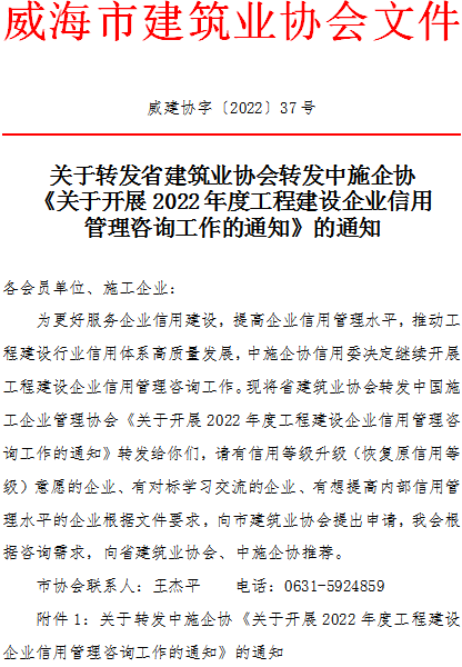 關(guān)于轉(zhuǎn)發(fā)省建筑業(yè)協(xié)會(huì)轉(zhuǎn)發(fā)中施企協(xié)《關(guān)于開(kāi)展2022年度工程建設(shè)企業(yè)信用管理咨詢(xún)工作的通知》的通知