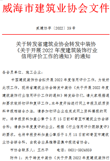 關(guān)于轉(zhuǎn)發(fā)省建筑業(yè)協(xié)會轉(zhuǎn)發(fā)中裝協(xié)《關(guān)于開展2022年度建筑裝飾行業(yè)信用評價工作的通知》的通知