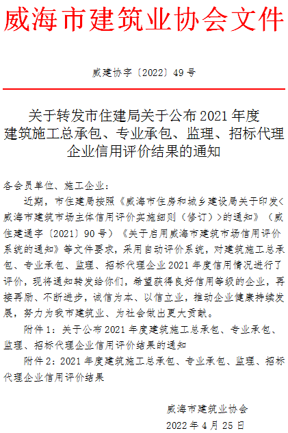 關(guān)于轉(zhuǎn)發(fā)市住建局關(guān)于公布2021年度建筑施工總承包、專業(yè)承包、監(jiān)理、招標(biāo)代理企業(yè)信用評價結(jié)果的通知