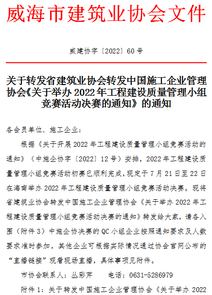 關(guān)于轉(zhuǎn)發(fā)省建筑業(yè)協(xié)會(huì)轉(zhuǎn)發(fā)中國(guó)施工企業(yè)管理協(xié)會(huì)《關(guān)于舉辦2022年工程建設(shè)質(zhì)量管理小組競(jìng)賽活動(dòng)決賽的通知》的通知