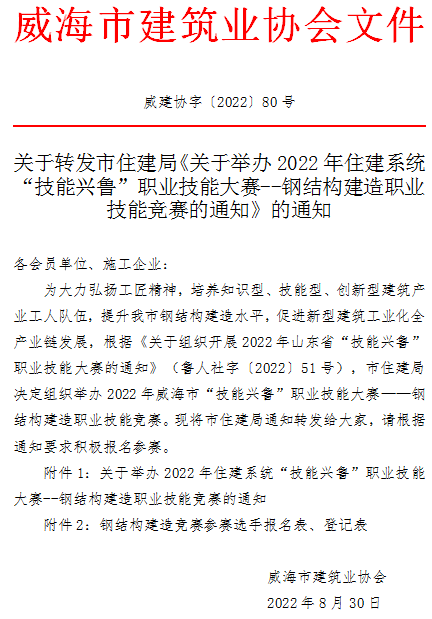 關(guān)于轉(zhuǎn)發(fā)市住建局《關(guān)于舉辦2022年住建系統(tǒng)“技能興魯”職業(yè)技能大賽--鋼結(jié)構(gòu)建造職業(yè)技能競(jìng)賽的通知》的通知