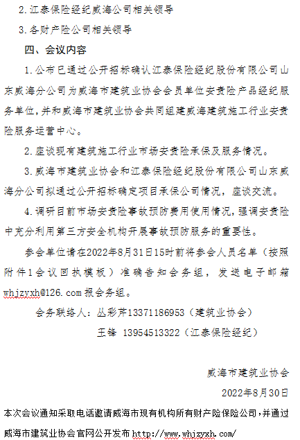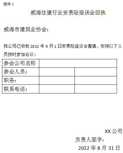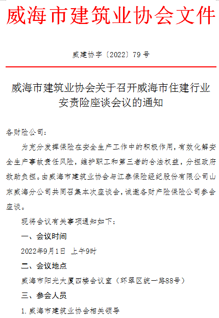 >威海市建筑業(yè)協(xié)會關(guān)于召開威海市住建行業(yè)安責(zé)險座談會議的通知