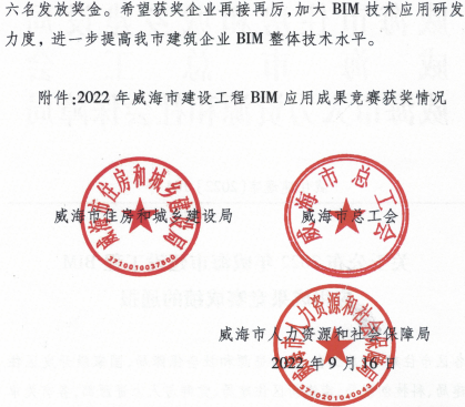 關(guān)于公布2022年威海市建設(shè)工程BIM應(yīng)用成果競賽成績的通報(bào)