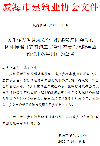 關(guān)于轉(zhuǎn)發(fā)省建筑安全與設(shè)備管理協(xié)會發(fā)布團體標(biāo)準(zhǔn)《建筑施工安全生產(chǎn)責(zé)任保險 事故預(yù)防服務(wù)導(dǎo)則》的公告