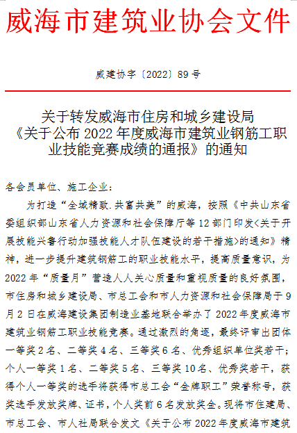 2022年89號(hào)關(guān)于轉(zhuǎn)發(fā)威海市住房和城鄉(xiāng)建設(shè)局《關(guān)于2022年度威海市建筑業(yè)鋼筋工職業(yè)技能競(jìng)賽成績(jī)的通報(bào)》的通知