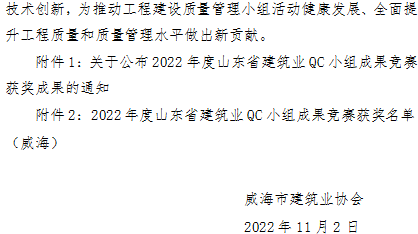 >關(guān)于公布2022年度山東省建筑業(yè)QC小組成果競賽獲獎成果的通知