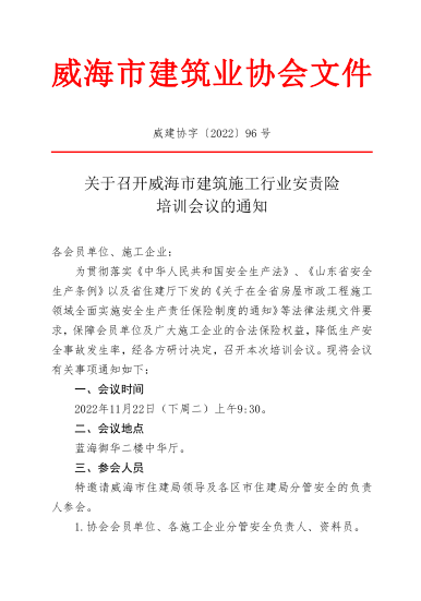 關(guān)于召開威海市建筑施工行業(yè)安責險 培訓會議的通知