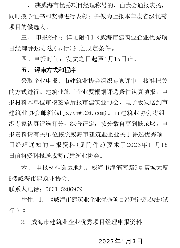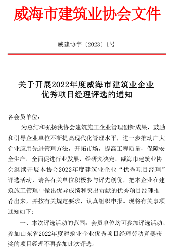 關于開展2022年度威海市建筑業(yè)企業(yè)優(yōu)秀項目經(jīng)理評選的通知