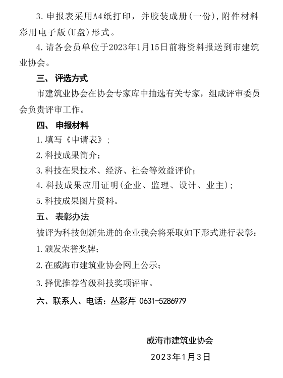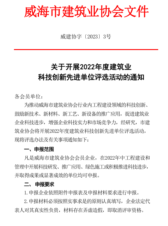 威海市建筑業(yè)協(xié)會關(guān)于評選 2022年度威海市建筑業(yè)先進(jìn)單位的通知