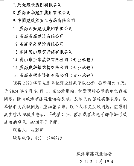 >威建協(xié)字2024年7號威海市建筑業(yè)協(xié)會關于2023年度先進單位評選結(jié)果的公示
