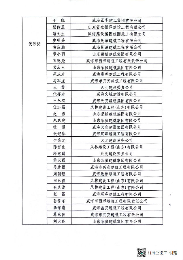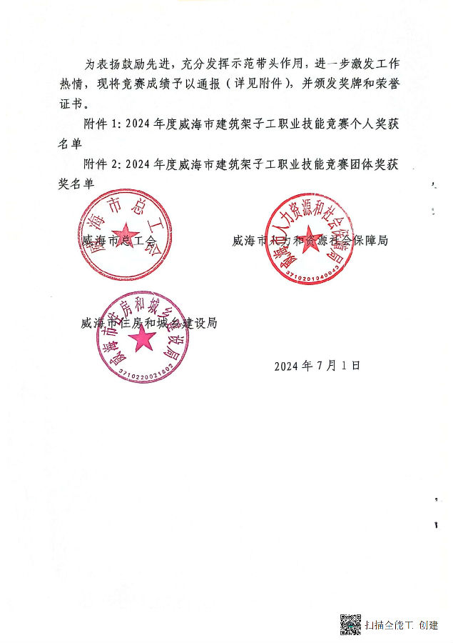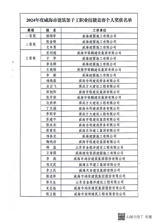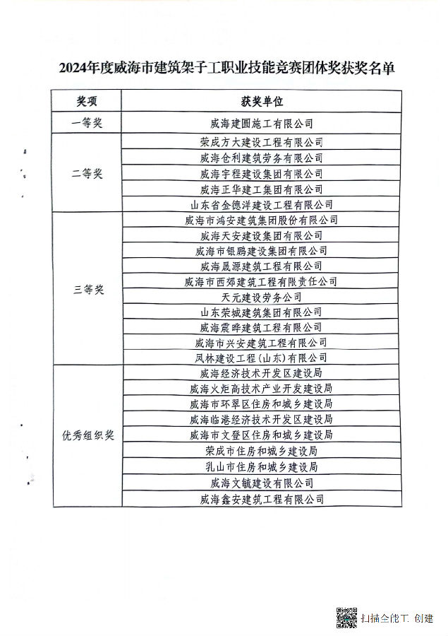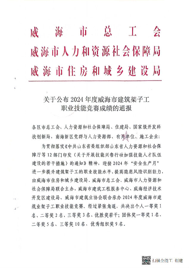 >關(guān)于公布2024年度威海市建筑架子工職業(yè)技能競賽成績的通報