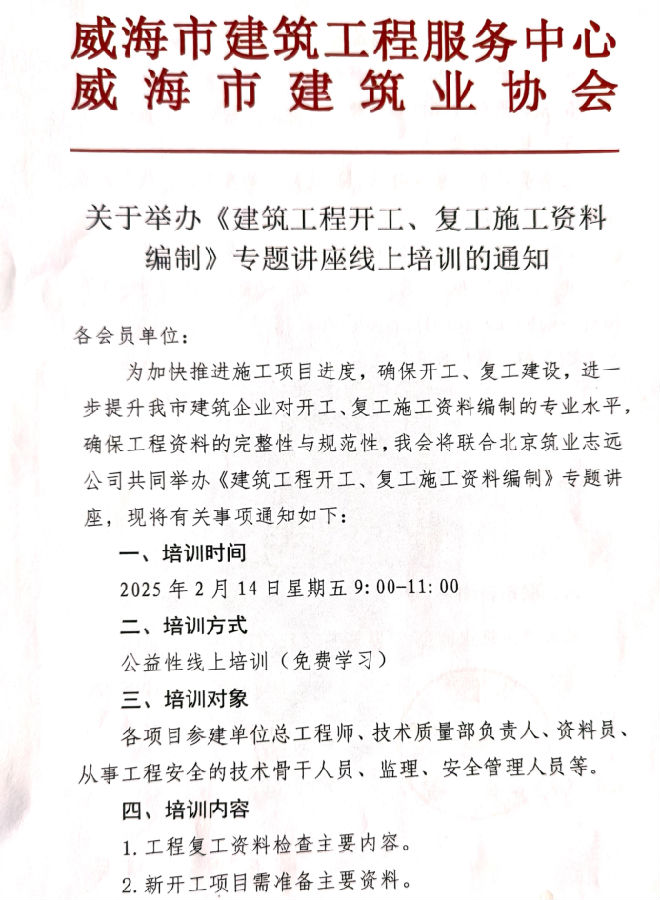 >關(guān)于舉辦《建筑工程開工、復(fù)工施工資料編制》專題講座線上培訓(xùn)的通知