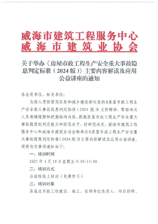 關于舉辦《房屋市政工程生產(chǎn)安全重大事故隱患判定標準(2024版)》主要內(nèi)容解讀及應用公益講座的通知